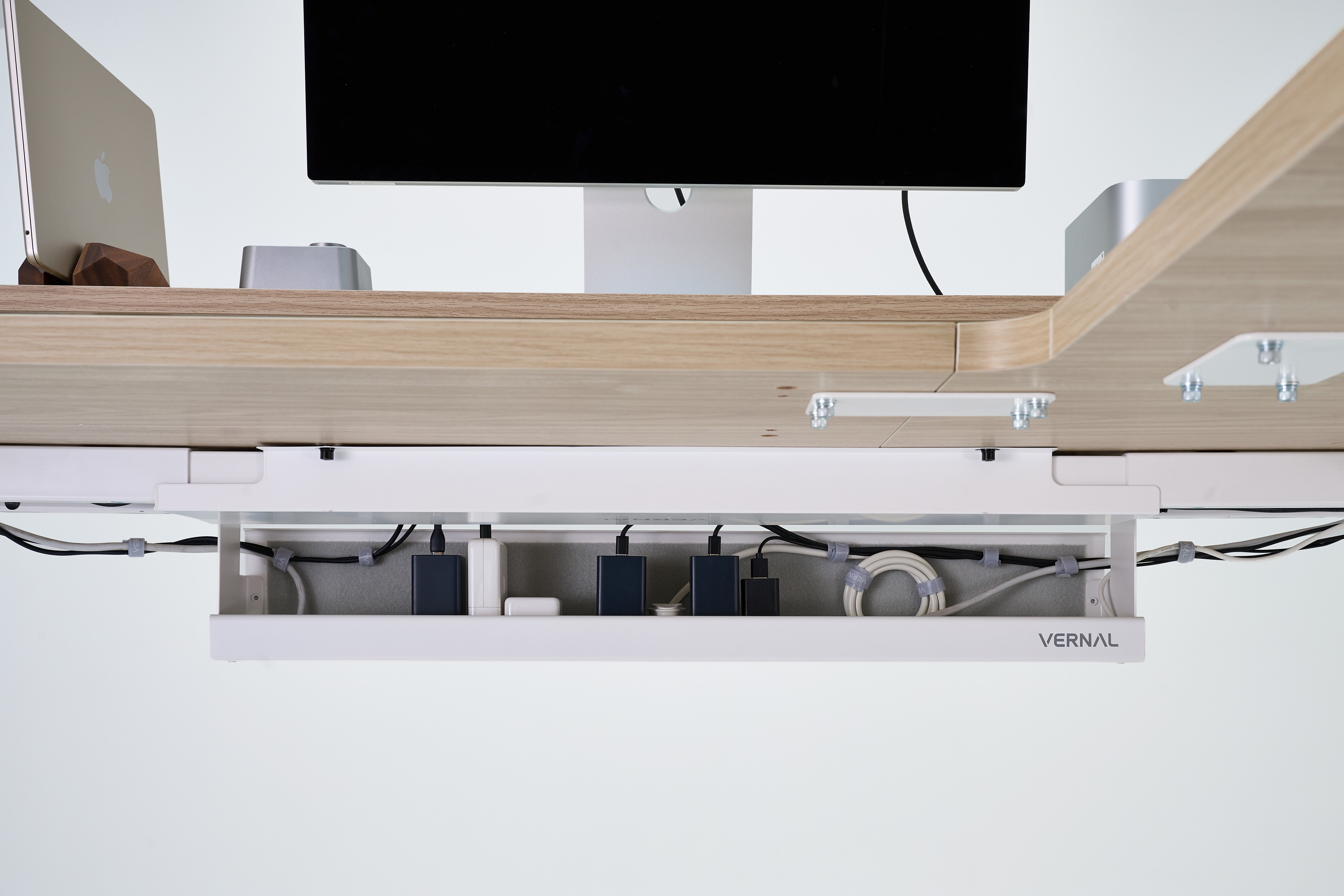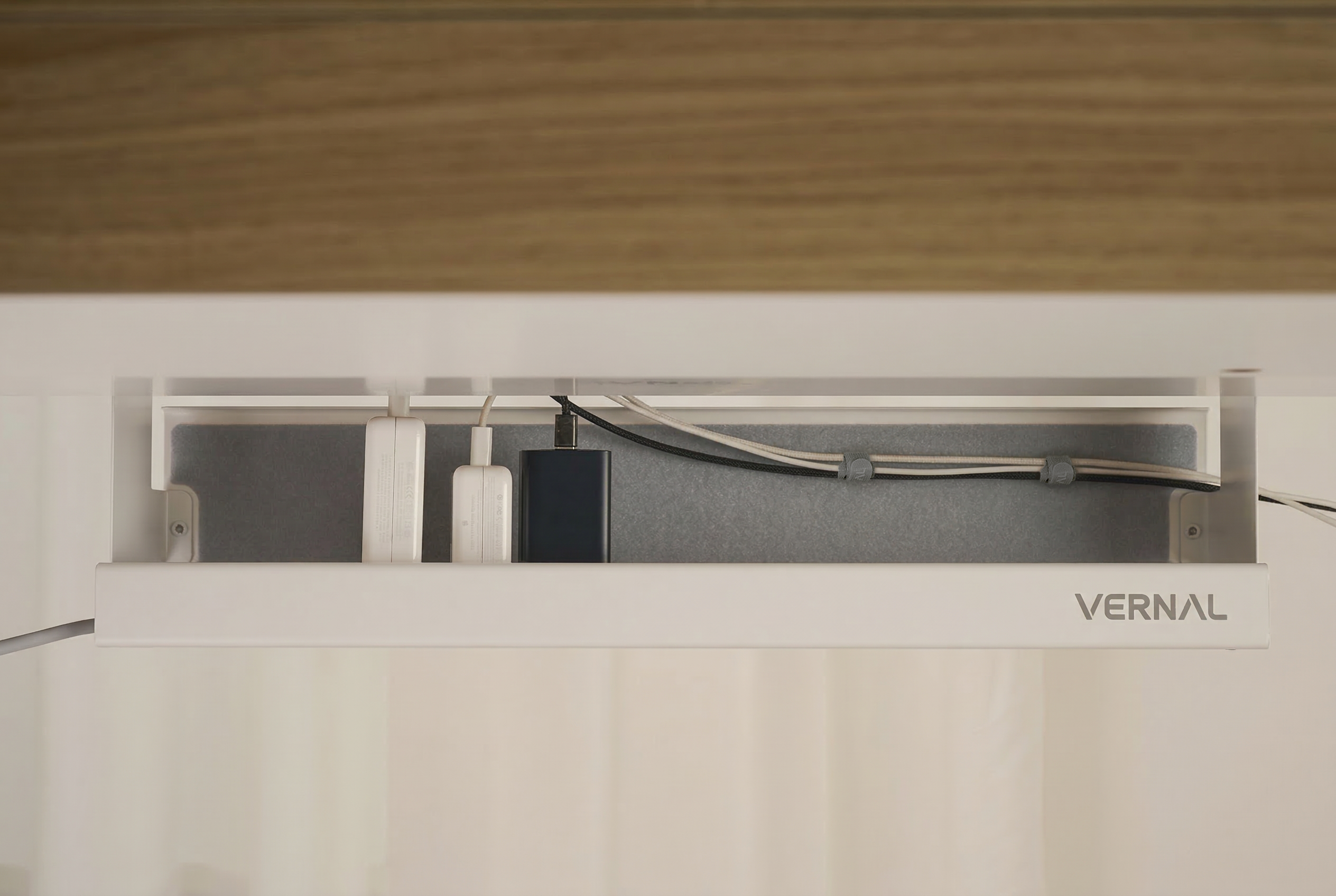 Note: On L-shaped desks, the Vernal Cable Management Tray can only be installed along the main desktop; the shorter side section cannot accommodate the cable rack.