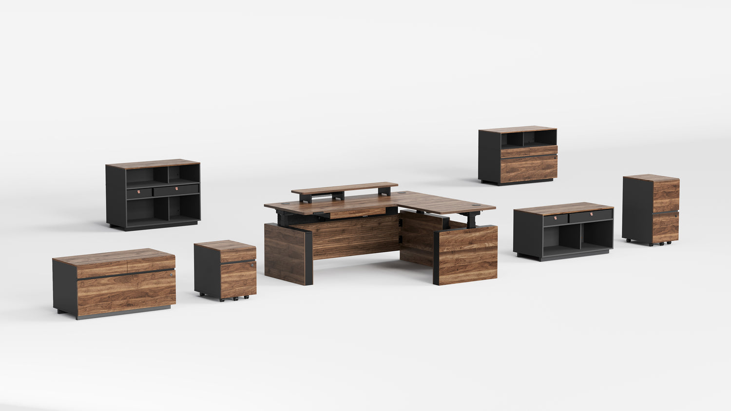 The Vernal Executive Collection combines contemporary design with warm wood tones. The executive desk features three-sided leg panels and a modesty panel with soft curves, maintaining openness while offering privacy. Rounded edges and clean lines convey understated professionalism. Available in deep and light walnut, surfaces showcase natural grain with a smooth touch. Matching cabinets and display units unify work, storage, and presentation, balancing aesthetics with everyday functionality for premium workspaces.