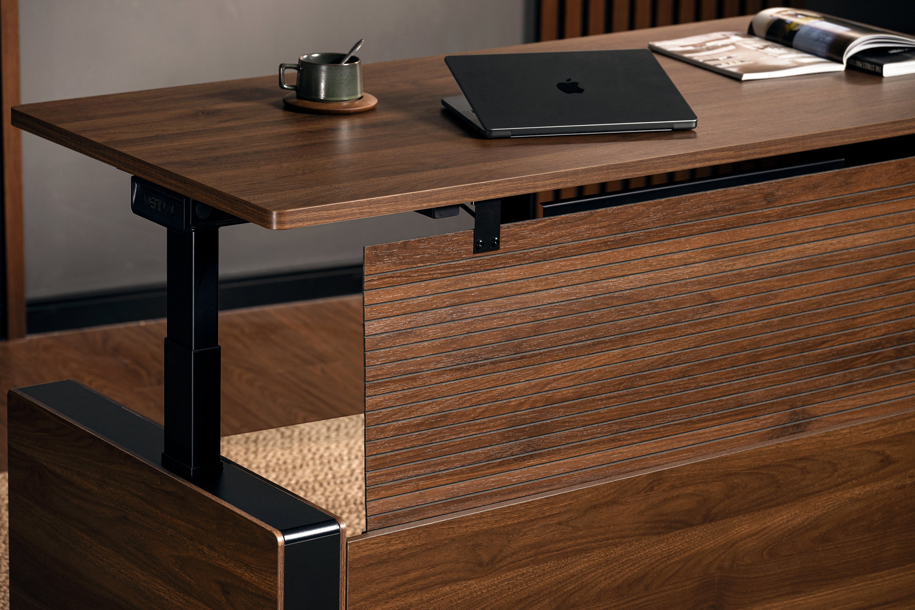 The Vernal Executive Collection combines contemporary design with warm wood tones. The executive desk features three-sided leg panels and a modesty panel with soft curves, maintaining openness while offering privacy. Rounded edges and clean lines convey understated professionalism. Available in deep and light walnut, surfaces showcase natural grain with a smooth touch. Matching cabinets and display units unify work, storage, and presentation, balancing aesthetics with everyday functionality for premium workspaces.