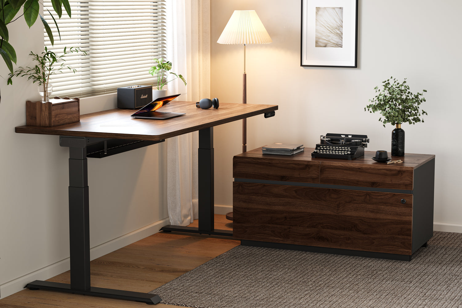 Available in two color options to match your standing desk. Designed to seamlessly adjust to the appropriate height, creating a cohesive workspace.